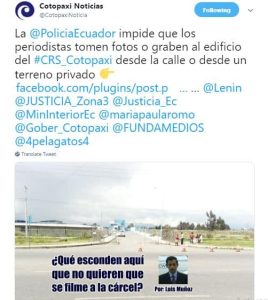 Este 19 de noviembre, Luis Muñoz, periodista de Cotopaxi Noticias, denunció a través de Twitter el impedimento por parte de la Policía Nacional de realizar coberturas en los exteriores del Centro de Rehabilitación Social (CRS) de Latacunga. Varios de sus colegas se adhirieron a la denuncia, manifestando que esta se ha convertido en una práctica constante desde que Jorge Glas está internado en la institución.