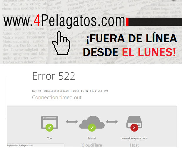 Al acceder al sitio, los navegantes recibían notificaciones de errores 503 y 522, relacionados con el tiempo máximo de respuesta para cargar una página (timeout). Desde entonces solo se puede visitar el sitio en modo de lectura, gracias a la imagen-espejo que el servidor CloudFlare guarda de 4pelagatos.com