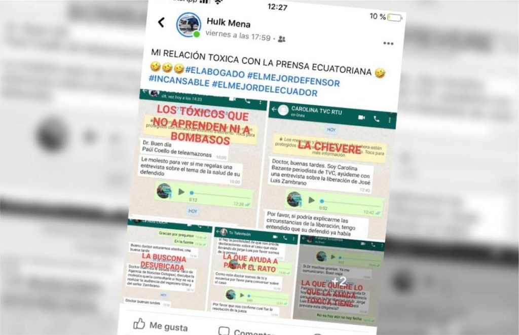Ecuador, 9 de junio 2020.- Periodistas de varios medios de comunicación fueron expuestos en el perfil de Facebook de Harrison Salcedo, abogado del exvicepresidente Jorge Glas y de Jorge Luis Zambrano, alias Rasquiña, líder de la banda delictiva Los Choneros