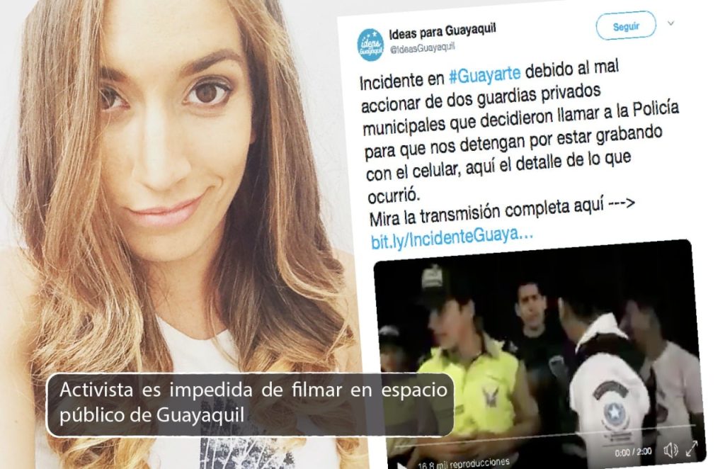 La activista Nathalie Vergara, conocida como ‘Natta Cassette’, denunció conductas abusivas de “guardias municipales privados” de la Plaza Guayarte, en Guayaquil (costa ecuatoriana) el pasado 7 de marzo. En el canal de Facebook, Ideas para Guayaquil, afirmó que empleados de la compañia de seguridad privada ICSSE Cia. Ltda., contratada por el Municipio de Guayaquil -y que en su uniforme portan el logo de la institución-, junto a miembros de la Policía Nacional, detienen a ciudadanos por grabar o tomar fotografías en espacios públicos.