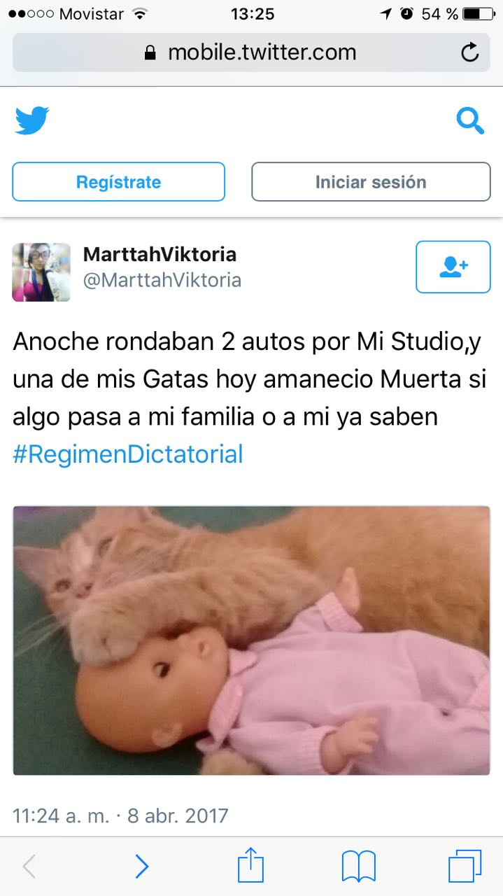 A estos hechos se suman denuncias de una actriz y activista por los derechos de los animales, Martha Robles quien en su cuenta de Twitter @MarttahViktoria denunció: “Anoche rondaban 2 autos por Mi Studio, y una de mis Gatas hoy amanecio Muerta si algo pasa a mi familia o a mi ya saben #RegimenDictatorial”. Maldonado aseguró que conoce a la activista y que la muerte de su mascota se dio por un envenenamiento severo, después de que desconocidos ingresaran a su casa.