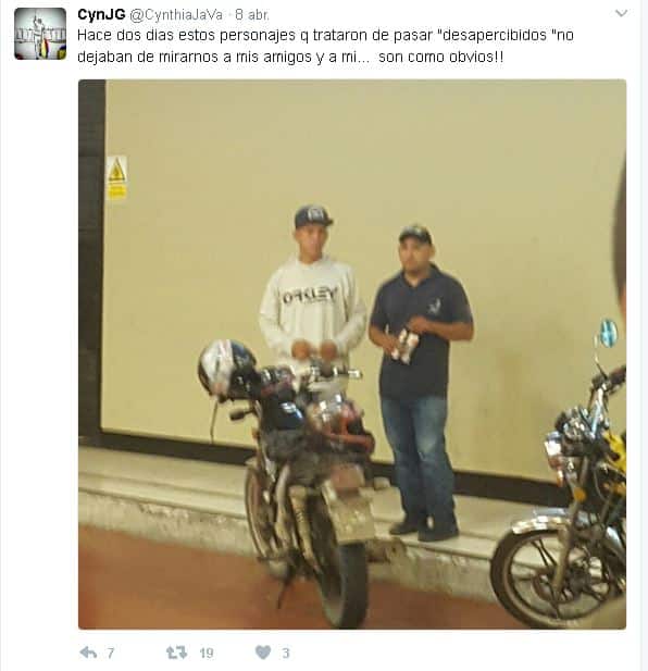 En otro caso denunciado por Twitter, @CynthiaJaVa aseguró que “dos personajes que trataron de pasar "desapercibidos "no dejaban de mirarnos a mis amigos y a mi... son como obvios!!”, al que adjuntó una fotografía.