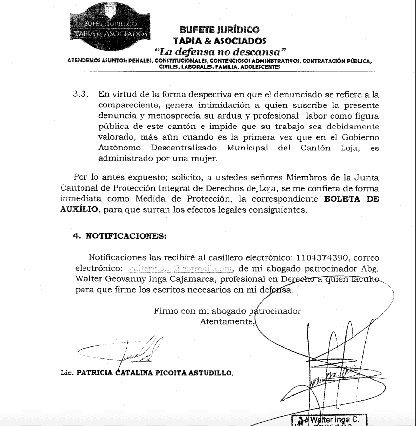 Picoita solicitó una boleta de auxilio como una medida de protección. El 17 de junio, la Junta Cantonal de Protección de Derechos de Loja, que ella preside, resolvió conceder lo solicitado a favor de la Alcaldesa. Incluso, se dispuso que la Secretaría Zonal de Derechos Humanos coloque a la autoridad un programa de atención especializada para brindar atención psicológica.
