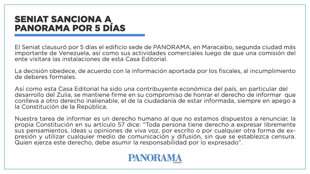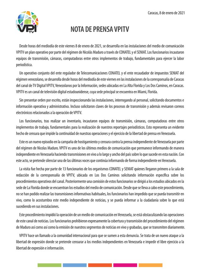 La jornada de este viernes 8 de enero de 2021, tres días después que asumiera la nueva Asamblea Nacional en manos del chavismo bajo unas elecciones cuestionadas, el Ejecutivo venezolano ordenó la visita de la Comisión Nacional de Telecomunicaciones (Conatel) y del Servicio Nacional Integrado de Administración Aduanera y Tributaria (Seniat) a dos medios de comunicación, Panorama y VPITV dónde hubo cierre por cinco días e incautación de equipos de transmisión respectivamente.