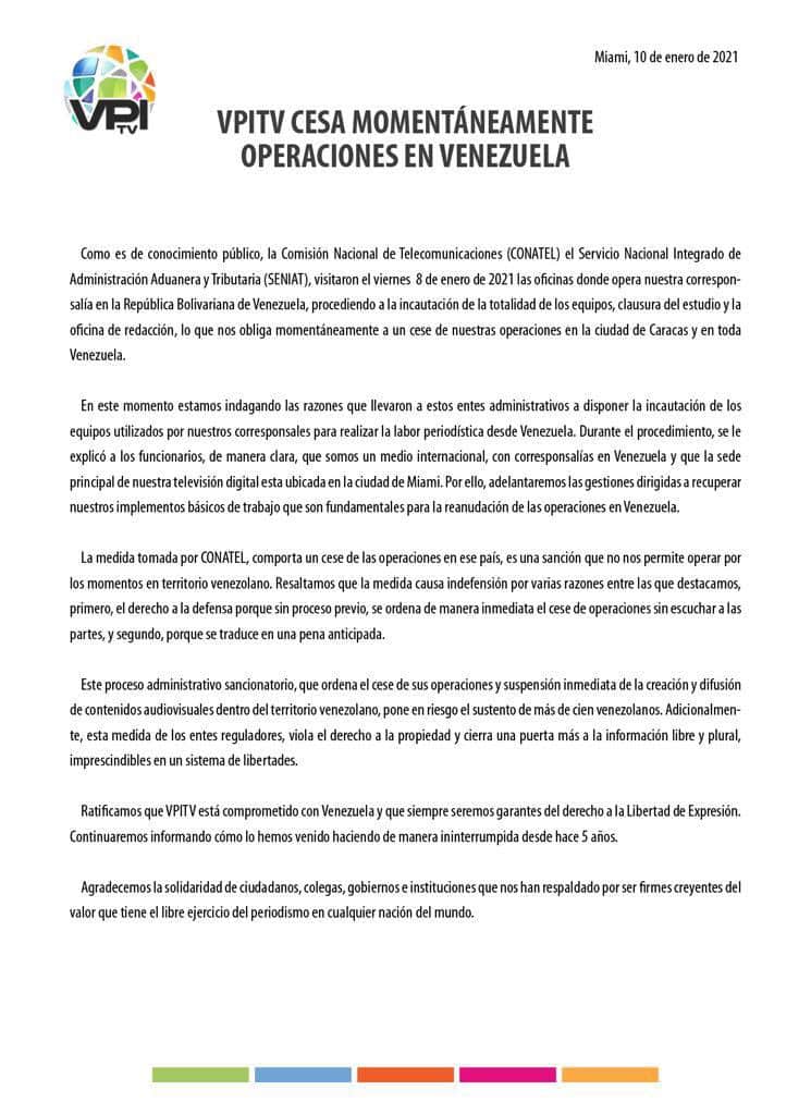 La tarde de este domingo 10 de enero de 2021 el medio VPITV a través de su cuenta twitter comunicó «oficialmente a la opinión pública y a la comunidad internacional sobre el cese momentáneo de sus operaciones en Venezuela, tras la medida sancionatoria tomada por CONATEL que prohibe la creación y difusión de contenidos audiovisuales dentro de Venezuela».