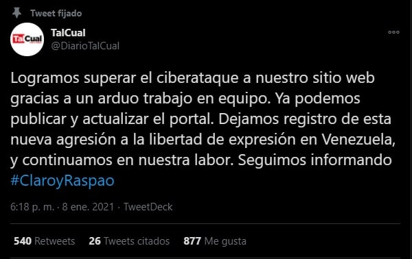Pero el ataque no se detuvo allí. El medio digital Tal Cual, crítico con el gobierno de Nicolás Maduro, también reportó ese mismo día un ciberataque a su plataforma web y lo denunció como un ataque a la libertad de expresión.
