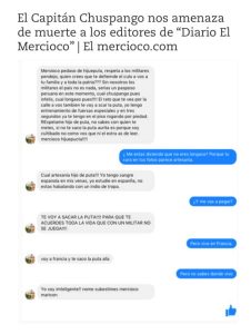 En diálogo con Fundamedios, el Capitán Ortega aseguró que tras publicar ese mensaje, que posteriormente decidió eliminarlo, se activaron “correístas” con amenazas en Facebook, en donde hasta llegaron a publicar sus datos personales, incluidas fotos de la entrada de su casa y su número personal de teléfono. Tras esto, desde la cuenta del Capitán se escribieron insultos y hasta una amenaza al portal de fake news ElMercioco con faltas ortográficas incluídas, las cuales Ortega negó que hayan sido de su autoría. Sobre esta supuesta amenaza al Mercioco, el portal sacó una nota con las capturas de pantalla correspondientes.