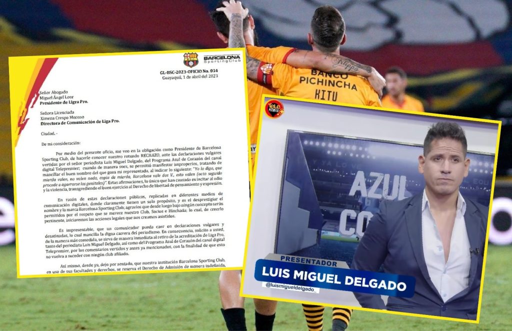 Ecuador, 04 de abril de 2023· El equipo de fútbol Barcelona Sporting Club envió una carta al presidente de la Liga Pro, Miguel Angel Loor, solicitando que se retire la acreditación al comentarista Luis Miguel Delgado, a su programa y al canal digital al que pertenece: Telepremier Plus. Esto se da tras unas declaraciones que el club ha catalogado como “vulgares”.