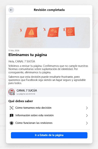 Seis días después, el 9 de febrero, el director de Canal 7 Sucúa, Rashid Cueva, recibió una alerta solicitando un código de autenticación. De forma inmediata, la página de Facebook fue suspendida. La notificación indicó: “Se anuló la publicación de tu página por violar las normas de comunidad (…) si tu contenido vuelve a infringir nuestras normas comunitarias, es posible que se restrinja o inhabilite tu cuenta”.