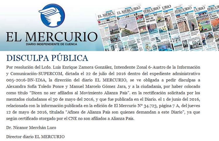 Diario El Mercurio de Cuenca fue sancionado este 22 de julio con la obligación de publicar dos veces una rectificación y pedir disculpas públicas. La Intendencia de la Información y Comunicación Zonal 6 emitió esa medida administrativa porque el periódico tituló un pedido de rectificación de los ciudadanos Alexandra Toledo y Manuel Gómez Jara, quienes denunciaron al medio por sentirse afectada su honra.