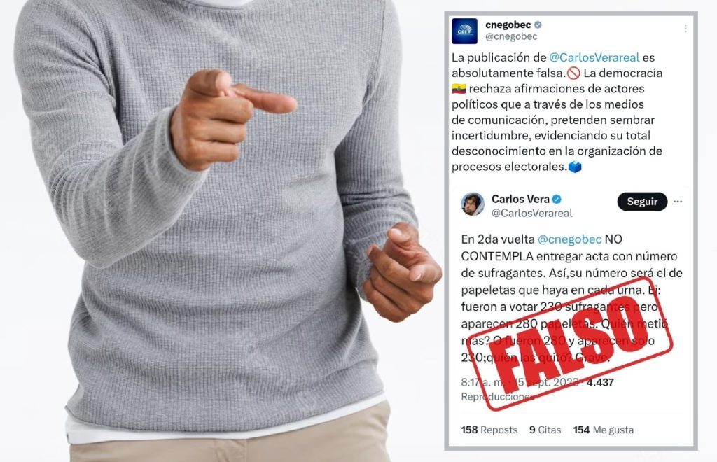 El 15 de septiembre, el CNE señaló que una publicación de Vera era "absolutamente falsa". Vera escribió: "En segunda vuelta, el CNE no contempla entregar acta con número de sufragantes. Así, su número será el de papeletas que haya en cada urna. Ej: fueron a votar 230 sufragantes, pero aparecen 280 papeletas. ¿Quién metió más? O fueron 280 y aparecen solo 230; ¿quién las quitó? Grave". Esta acusación fue publicada nuevamente por la autoridad electoral, con la palabra "FALSO" sobre ella, en letras rojas.