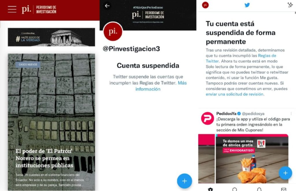 Ecuador, 9 de junio de 2022. La cuenta de Twitter del portal Periodismo de Investigación fue suspendida por la red social luego de publicar una investigación sobre Leandro Antonio Norero Tigua, un sospechoso de corrupción y narcotráfico que operaba en Ecuador y ahora reside en Miami.