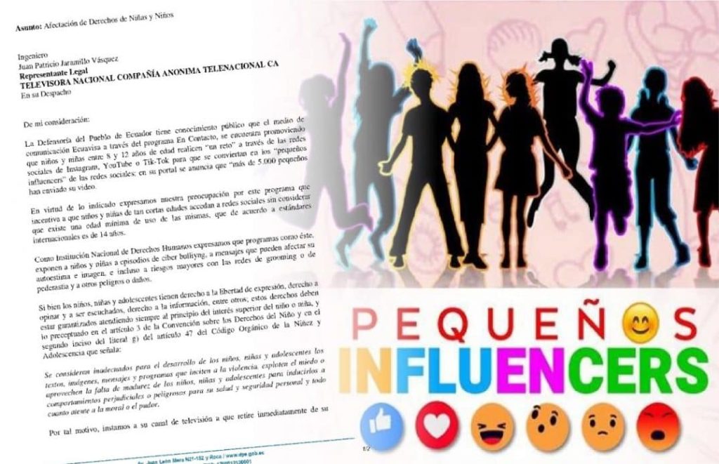 El 04 de marzo, la Defensoría del Pueblo envió un comunicado al canal Ecuavisa en el cual insta a retirar inmediatamente de su parrilla el segmento “Pequeños Influencers”. La institución asegura que ese tipo de programas puede afectar el autoestima e imagen de los niños e, incluso, exponerlos a riesgos mayores como acoso cibernético y/o pederastia.