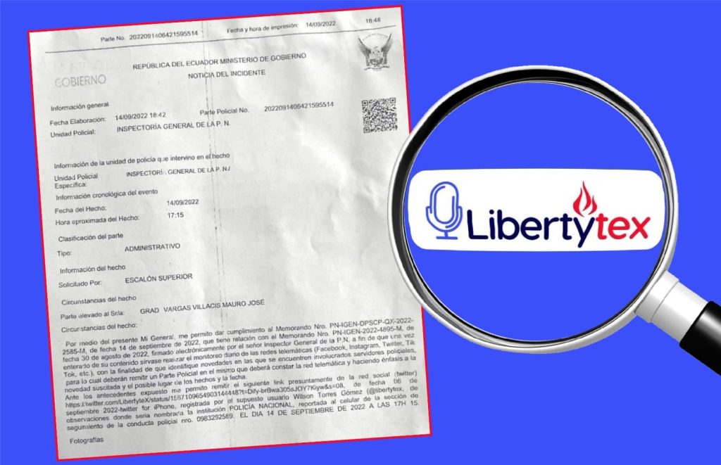 Ecuador, 9 de marzo de 2023· La Dirección de Inteligencia de la Policía Nacional recibió órdenes explícitas para realizar un monitoreo diario de las redes sociales y los contenidos del portal digital LibertyTex -que publica material relacionado con la institución policial- luego de replicar los mensajes de un Coronel.