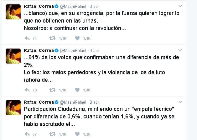 Tras la rueda de prensa ofrecida por Hidalgo, el presidente Rafael Correa cuestionó los resultados entregados por la Corporación Participación Ciudadana y acusó a la organización de ser “cómplice de la incertidumbre y la violencia que quiso generar la derecha”. Así lo dijo en declaraciones recogidas por el medio de gobierno El Ciudadano, tras cuestionar por qué esa organización habló de un empate técnico y una diferencia del 0,6% sin dar cifras, cuando, según él, tenían una diferencia del 1,6%.