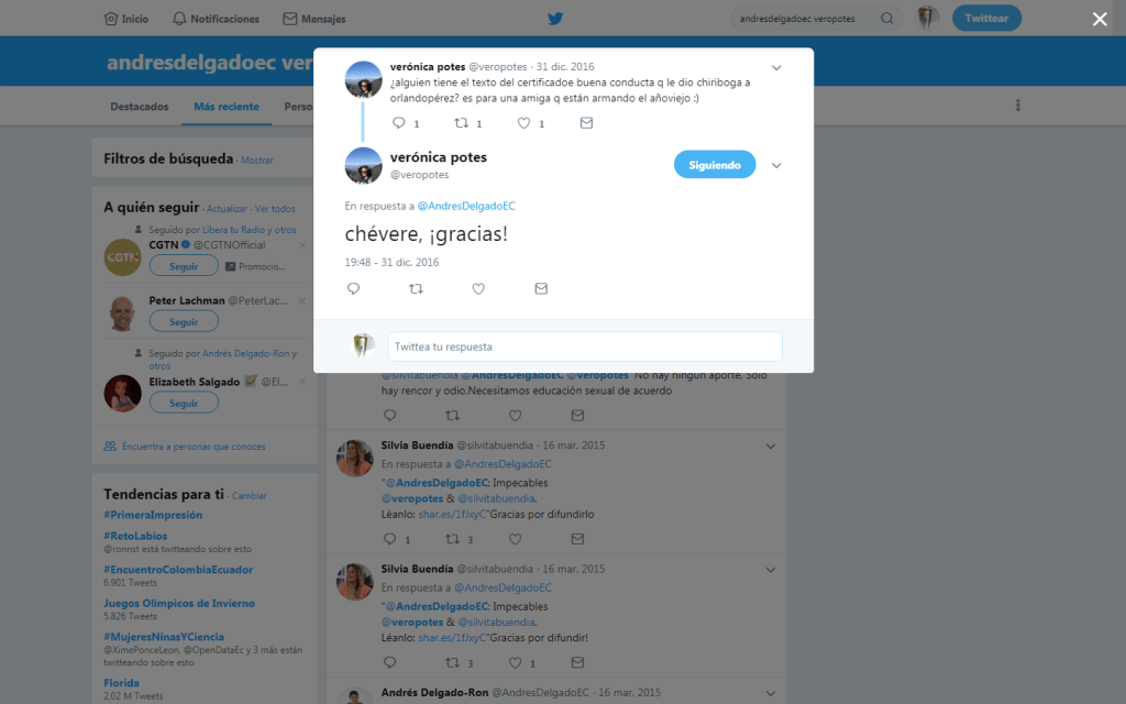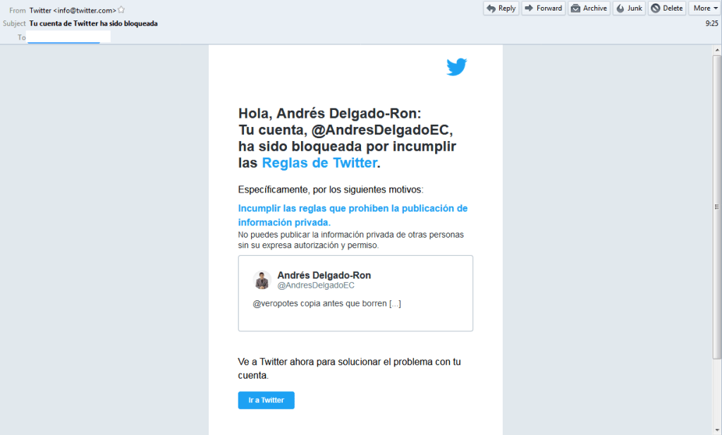Durante 12 horas, el tuitero Andrés Delgado @AldresDelgadoEC fue impedido de utilizar su cuenta de Twitter. La red social decidió bloquearlo temporalmente este 16 de febrero de 2018 por “publicar información privada sin autorización expresa”, por un ‘retuit’ de un mensaje de otra usuaria, quien había publicado una fotografía de un monigote del periodista y exdirector del diario estatal El Telégrafo, Orlando Pérez, en diciembre de 2016.
