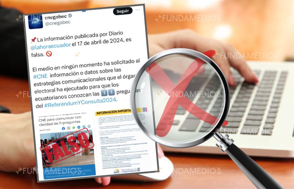 La noche del viernes 19 de abril, el CNE señaló en un post de redes sociales que en ningún momento el medio ha solicitado información o datos sobre las estrategias de comunicación que el órgano electoral ha ejecutado para que los ecuatorianos conozcan las preguntas. Acompañó su post con la frase: “La información publicada por La Hora el 17 de abril de 2024 es falsa”. Sin aportar, por cierto, ninguna evidencia de que sea falsa.