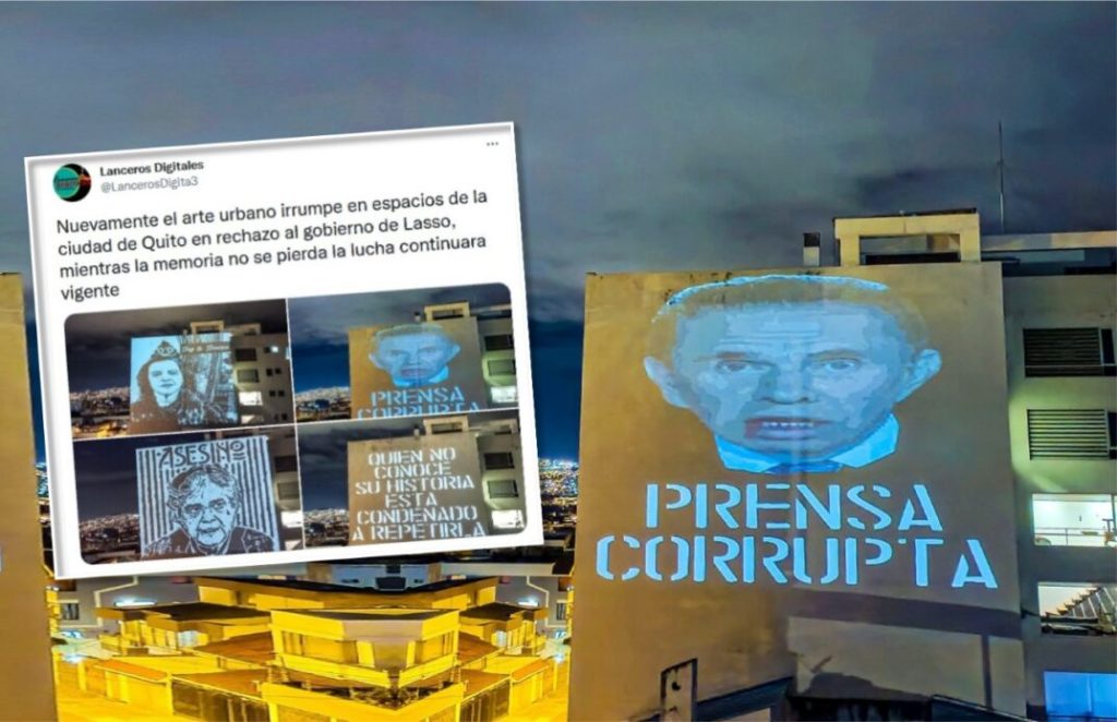 Ecuador 14 de junio de 2022· Tras las movilizaciones que se realizaron desde 13 de junio, los discursos de odio contra la prensa se incrementaron. Varios manifestantes tildaron de corrupta a la prensa. Esta vez una cuenta de Twitter —vinculada con el movimiento indígena— publicó varias fotografías de proyecciones realizadas en Quito. En las frases de oposición al Gobierno, aparece el presidente Guillermo Lasso. Pero, también se proyectó la imagen del periodista de Ecuavisa Alfonso Espinosa de los Monteros. Debajo de su rostro se observó la siguiente frase: “prensa corrupta”.