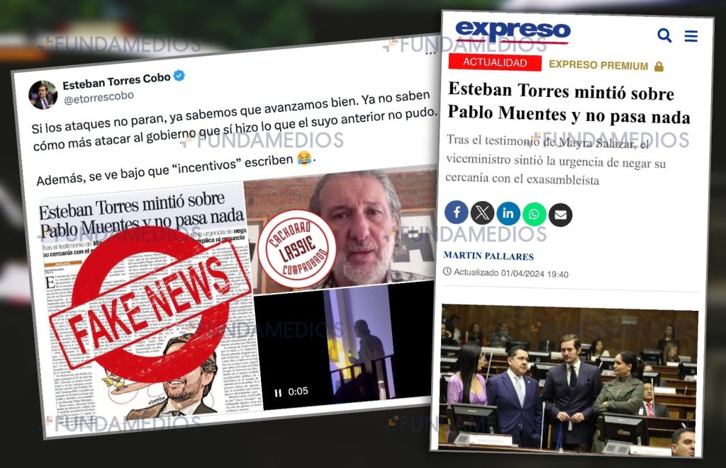 Ecuador, 2 de abril de 2024· Esteban Torres tildó de “Fake news” a una nota publicada por el periodista Martín Pallares en diario Expreso, en la que se refiere a un supuesto tuit, que atribuye a Torres, en el que habría elogiado y defendido a Pablo Muentes, exasambleísta socialcritiano, hoy involucrado en el caso ‘Purga’.