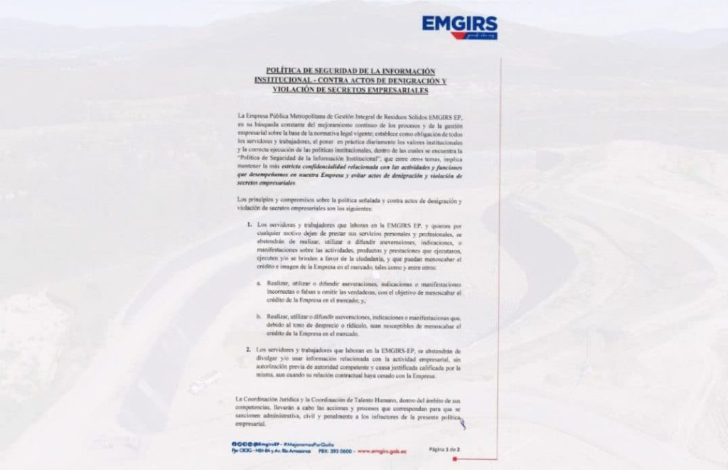 Ecuador 20 de mayo de 2021. La Empresa Pública Metropolitana de Gestión Integral de Residuos Sólidos, EMGIRS-EP del Municipio de Quito emitió una Política de Seguridad de la Información Institucional contra actos de denigración, violación de secretos empresariales, cuyo contenido atenta contra los tratados internacionales y los principios constitucionales que protegen el derecho de los ecuatorianos a informar y ser informados.