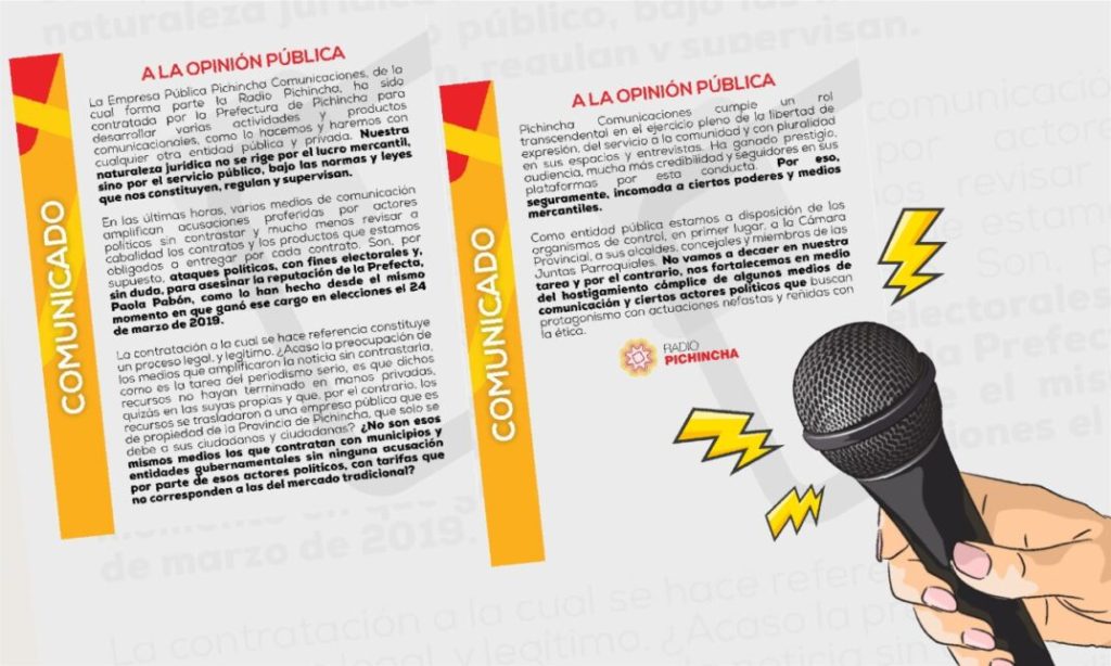 Este Comunicado se publicó luego de que varios medios de comunicación empezaron a investigar sobre un contrato firmado entre esta Empresa Pública y la Prefectura de Pichincha para el “servicio para la creación de contenido, promoción y difusión para fomentar las actividades comunicacionales del proyecto Bicentenario” por un valor de $481.902,58 (incluido IVA).