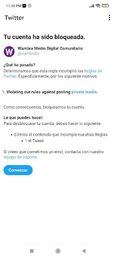 Ana Acosta Editora en jefe de Wambra Radio, comunicó a Fundamedios que la cuenta de Twitter del medio fue bloqueada bajo la premisa de que se incumplieron los parámetros de posteo de la red.