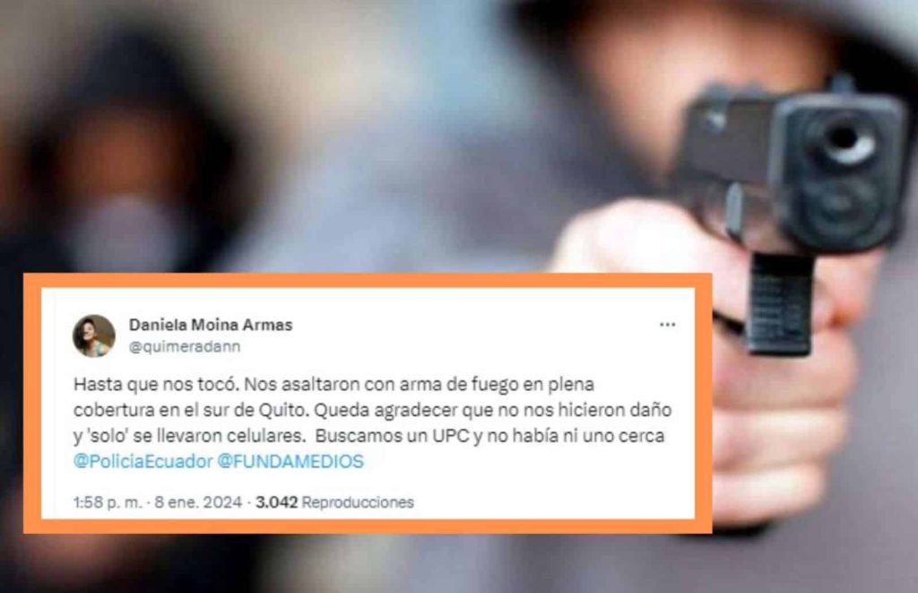 Ecuador, 08 de enero de 2024· La periodista de diario Extra Daniela Moina denunció que fue asaltada —junto a un colega— en el sur de Quito. Esto, mientras realizaba una cobertura periodística.