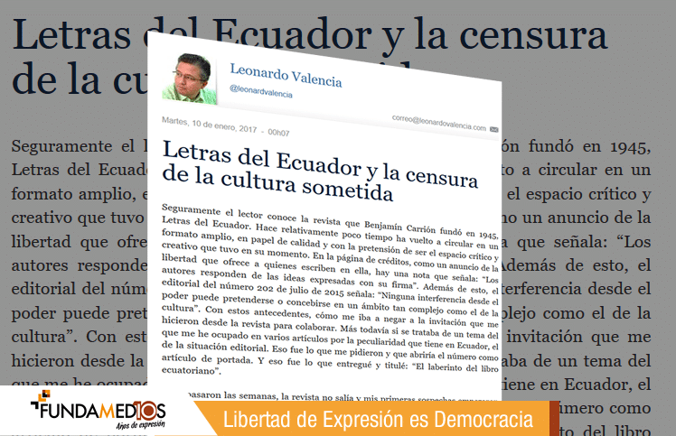 El escritor Leonardo Valencia denunció censura a un artículo de su autoría por parte de la revista cultural “Letras del Ecuador”, que decidió no publicarlo por haber mencionado al Presidente de la República en su escrito que trataba sobre la situación editorial y los distintos actores que están teniendo injerencia en ella. A través de un artículo publicado en diario El Universo el 10 de enero de 2017 y titulado “Letras del Ecuador y la censura de la cultura sometida”, el escritor aseguró que fue víctima de censura y que el único argumento que le dio la revista ecuatoriana gestionada por la Casa de la Cultura, fue haber mencionado al Jefe de Estado.