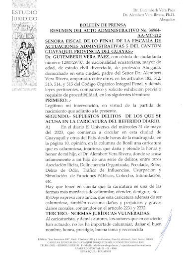 Ecuador, 02 de junio de 2023.- Ante la Fiscalía de lo Penal de Actuaciones Administrativas, el señor Gutemberh Vera Páez, padre del presidente del Consejo de Participación Ciudadana y Control Social (CPCCS), Alembert Vera, solicitó una actuación administrativa en relación con caricatura realizada por Xavier Bonilla (Bonil) en diario El Universo: “[…] acudo ante usted para que, en virtud de lo dispuesto en el Código Orgánico Integral Penal vigente […] se digne enviar atento oficio al DIRECTOR, PROPIETARIO O RESPONSABLE de “Diario EL UNIVERSO”, para que informe a usted el nombre del autor o responsable de la caricatura […] Además, que informe el nombre de la o las personas que autorizaron [su] publicación […]”.