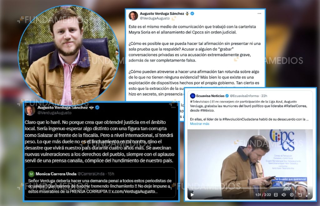 Ecuador, 24 de abril de 2025.- El exconsejero del Consejo de Participación Ciudadana y Control Social, Augusto Verduga, principal implicado en el caso Ligados y quien actualmente está en paradero desconocido, aseguró que va a demandar a los medios de comunicación que han participado en un “linchamiento” en su contra. Dijo que lo hará a nivel internacional porque no obtendrá justicia en el ámbito local. En dos publicaciones de su cuenta personal de X se refirió a la prensa como “canalla” y que “destruyen vidas sin ningún tipo de responsabilidad”. El caso Ligados investiga el posible delito de asociación ilícita cometido por figuras políticas con vínculos a un movimiento político, se encuentra en la fase de instrucción Fiscal.