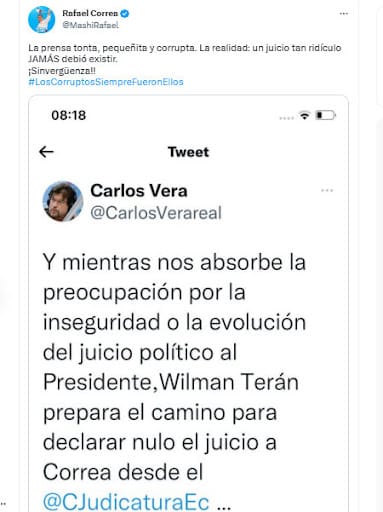 En este caso, en cambio, el ataque fue dirigido en contra el entrevistador Carlos Vera, por una publicación en la misma red social en la que advierte la posibilidad de una posible decisión judicial favorable al expresidente, quien está sentenciado por corrupción y prófugo de la justicia, aunque tiene estatus de refugio en Bélgica.