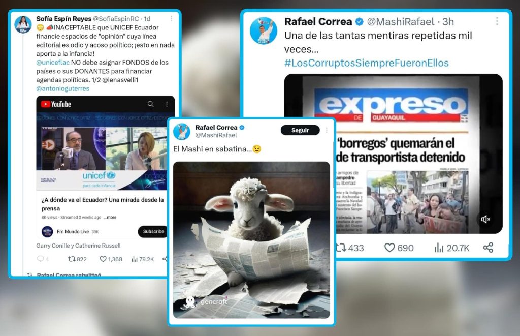 Ecuador, 26 de junio de 2023.- Al puro estilo de la década de violación a la libertad de expresión, el expresidente y ahora prófugo de la justicia, Rafael Correa, ha iniciado una senda campaña de estigmatización y ataque sistemático a la prensa nacional, aprovechando el contexto electoral actual, a través de la difusión, entre otros, de reportajes en que pone en tela de duda el trabajo periodístico y de investigación llevado adelante durante su gobierno y en la actualidad. El movimiento político que aún dirige, Revolución Ciudadana, está utilizando la imagen de un borrego, haciendo alusión al apodo que se utilizó en contra suya y de sus partidarios, para atacar a la prensa.