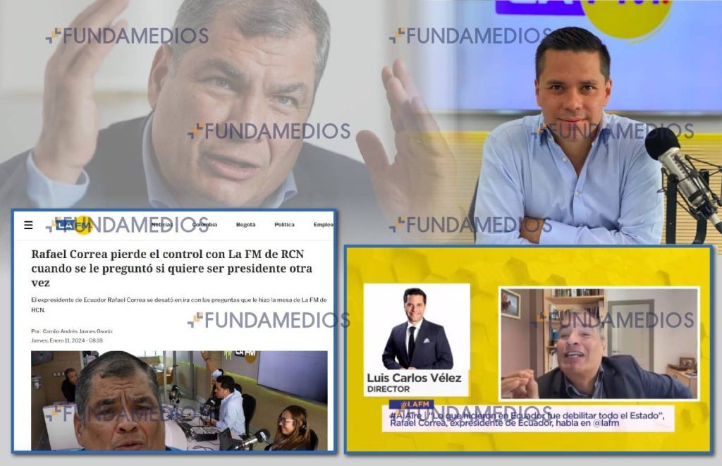 Ecuador, 11 de enero de 2024· Esta mañana, el expresidente Rafael Correa, sentenciado por corrupción y prófugo de la justicia —con estatus de refugio en Bélgica—, se exaltó por una pregunta que realizó el periodista y director de la radio La FM, de RCN, Luis Carlos Vélez. Durante toda la entrevista se mostró molesto y calificó al medio de “prensa mediocre”.