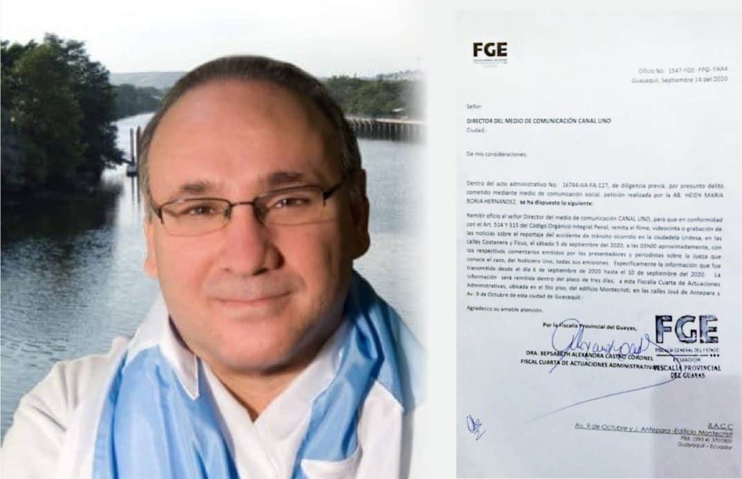 Ecuador, 22 de septiembre. La jueza Heidy María Borja Hernández solicitó a Canal UNO, a través de la Fiscalía del Guayas, que remita las grabaciones sobre las noticias y comentarios de los periodistas emitidos entre el 6 y 10 de septiembre sobre el reportaje del accidente de tránsito ocurrido el 5 de septiembre en Urdesa y que produjo la muerte de Roberto Malta, luego de una semana del suceso.