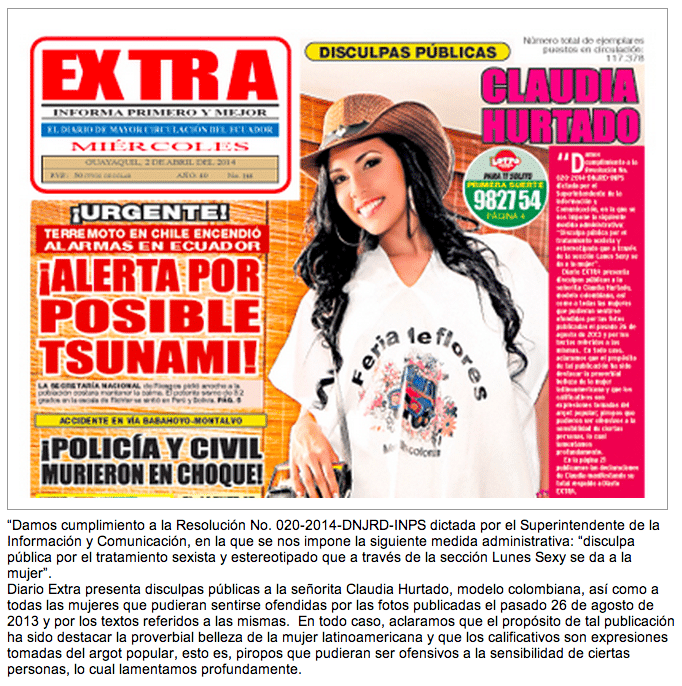 On March 27th, 2014, the Superintendence of Information and Communication (SUPERCOM) ordered, by resolution, that daily Extra should publish a public apology "for the sexist and stereotyped treatment that is given to women by the cover 'Monday Sexy'". This penalty occurs in the same week that the newspaper received a monetary fine of 10% of the averaged billing of the last three months for alleged recidivism, in another case.