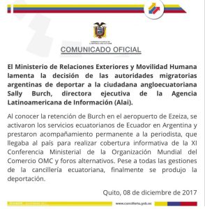 La madrugada del 8 de diciembre de 217, la periodista británica residente en Ecuador, Sally Burch, de la Agencia Latinoamericana de Información, fue deportada del aeropuerto de Ezeiza, rumbo a Quito, por órdenes del gobierno argentino, que le impidió ingresar a ese país, en donde tenía previsto participar en la cumbre de la Organización Mundial de Comercio (OMC), en Buenos Aires, según informaron medios argentinos.