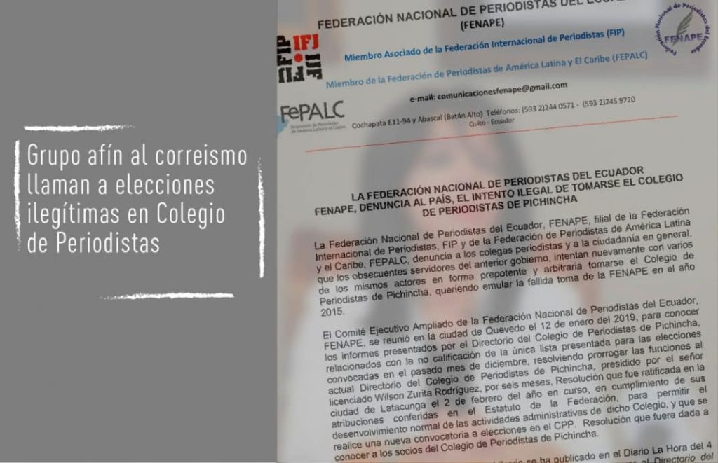 Este 5 de febrero de 2019, la Federación Nacional de Periodistas del Ecuador (FENAPE) denunció por medio de un comunicado que “obsecuentes servidores del anterior gobierno, intentan nuevamente con varios de los mismos actores en forma prepotente y arbitraria tomarse el Colegio de Periodistas de Pichincha, queriendo emular la fallida toma de la FENAPE en el año 2015”. Esto, después de que de manera ilegal y arbitraria se haya publicado en la edición del 4 de febrero de Diario La Hora la convocatoria a elecciones del Directorio por parte de una supuesta Asamblea General Extraordinaria, calificada de “ilegítima” por Susana Piedra, presidente de la organización.