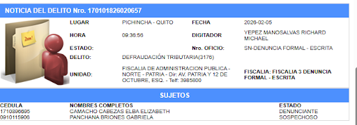 El 5 de febrero de 2026, la activista y analista política Gabriela Panchana fue objeto de una denuncia penal presentada ante la Fiscalía Provincial de Pichincha por Elba Camacho Cabezas- conocida usuario digital anteriormente militante afín al correísmo y hoy afín al oficialismo- la acusación es por presunta defraudación tributaria. La noticia del delito consta en el sistema de la Fiscalía General del Estado bajo el Nro. 170101826020657.