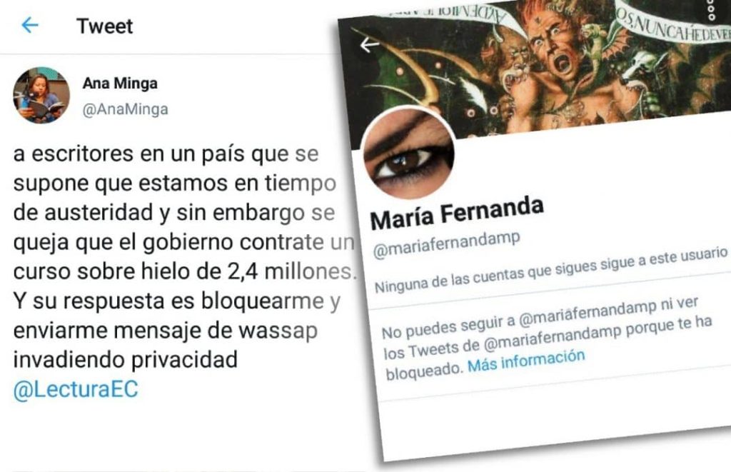 El 27 de enero, la periodista y escritora Ana Minga publicó la columna de opinión “La Cultura Institucional está pendiente señor Presidente”, en la revista digital Plan V. En el texto cuestiona la organización de la Feria Internacional del Libro de Quito 2019, organizada por el Plan Nacional del Libro y la Lectura (iniciativa del Ministerio de Cultura del Ecuador), cuya gerente es María Fernanda Ampuero (hasta finales de enero). Tras la publicación del texto, la funcionaria bloqueó a la autora de su cuenta personal de Twitter.