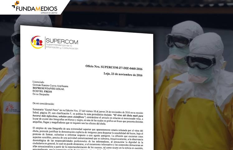 Por publicar una imagen de un brazo para graficar un tema sobre el virus del ébola, el periódico Ecotel Press, de Loja (Frontera sur del país) sufrió un llamado de atención de parte de la Intendenta Johanna Quinde quien dirige la Intendencia Zonal 7.