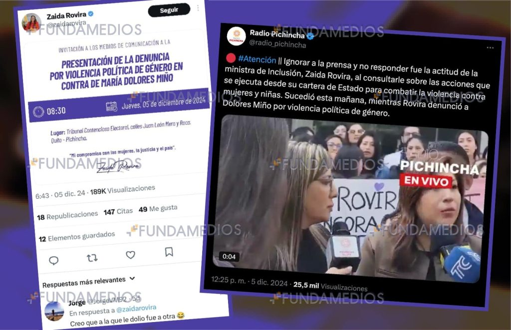 Además, Miño señaló que es súper grave que la Ministra Rovira haya utilizado fondos, recursos y personal público para perseguir a la disidencia. “Ella convoca a la rueda de prensa a través de los canales oficiales del Ministerio, llega a las 8:30 de un jueves; es decir en horas de trabajo y quien presenta la denuncia es Harold Burbano, viceministro de Inclusión. Entonces, hay dos cabezas de ministerio que ocupan horas de trabajo para presentar una denuncia”, añadió.