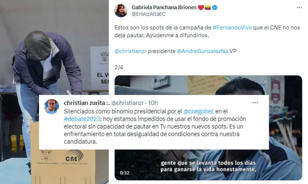 El 09 de agosto de 2023, el excandidato presidencial Fernando Villavicencio, fue asesinado al salir de un mitin político al norte de Quito. Esto sucedió cuatro días antes del debate presidencial, y once antes del día de la primera vuelta electoral. El periodista Christian Zurita explicó en la red social “X” (Twitter) que él, como reemplazo de Villavicencio, y el movimiento al que representa en general, fueron silenciados y prohibidos de participar en el debate. Y, tras esto, impedidos de usar el fondo de promoción electoral, que ha generado que no puedan pautar en televisión los nuevos spots publicitarios: “Es un enfrentamiento en total desigualdad de condiciones contra nuestra candidatura”, señaló.