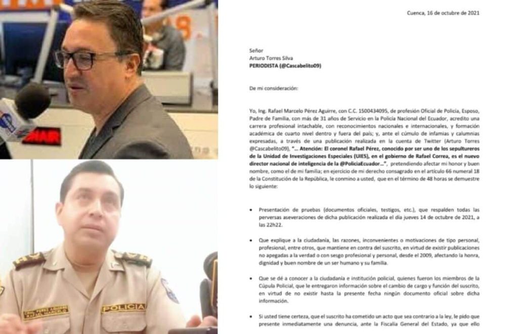 Ecuador, 18 de octubre de 2021. El Coronel de la Policía Nacional, Rafael Marcelo Pérez Aguirre, envió una carta al periodista de Código Vidrio, Arturo Torres, con términos amenazantes en la que solicitó conocer la fuente del periodista y además descalificó su trabajo, luego de que el comunicador lanzó un trino en Twitter.