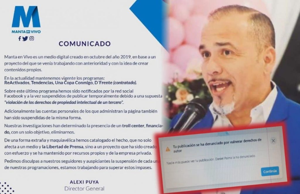 Ecuador, 18 de agosto de 2021. La página de Facebook del medio de comunicación digital Manta En Vivo, de la provincia de Manabí, está imposibilitada de publicar contenidos debido a una supuesta violación de los derechos de propiedad intelectual.