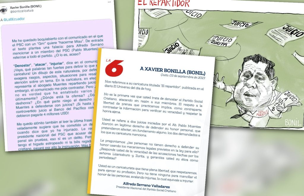 Ecuador, 05 de septiembre de 2023.- El movimiento político Partido Social Cristiano (PSC) publicó un texto amenazador, en el que criticó y menospreció una caricatura de Xavier Bonilla (Bonil), titulada “El repartidor”. La caricatura se refiere al exasambleísta del partido, Pablo Muentes, y a las múltiples demandas que ha presentado por supuestas afectaciones a su honra.