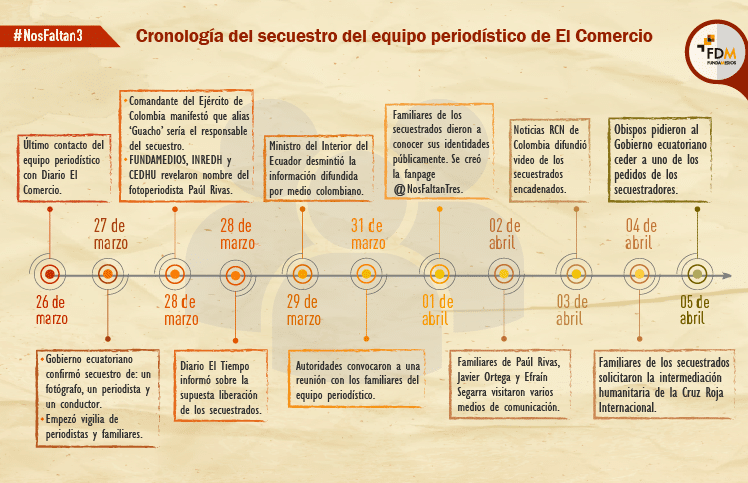 El pasado 26 de marzo de 2018 fue secuestrado un equipo periodístico de Diario El Comercio, en Mataje, frontera Norte con Colombia. Aún no han sido liberados. A continuación la cronología de lo ocurrido hasta el momento.