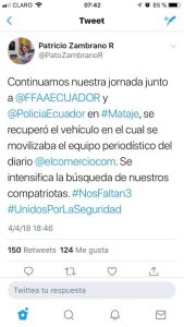 Ese mismo día, el ministro de Defensa, Patricio Zambrano, informó en su cuenta de Twitter que la camioneta en la que se movilizaba el equipo de El Comercio había sido recuperada. Ante eso, hubo reacciones y comentarios entre los manifestantes, quienes comentaron que se debe analizar en qué condiciones se encontraba el vehículo y que había en este. Pero, lo más importante es que los tres secuestrados vuelvan con vida y salud, según publicó Diario El Comercio.