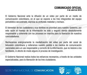 El gobierno de Ecuador, a través de un comunicado, manifestó su profundo malestar. “Rechazamos enérgicamente la mediatización del video por parte del canal de televisión colombiano y reiteramos el pedido a los medios de comunicación nacionales para un uso responsable y correcto de la información, que no lesione a los familiares, ni afecte de modo alguno el proceso de investigación….”, reza el documento.