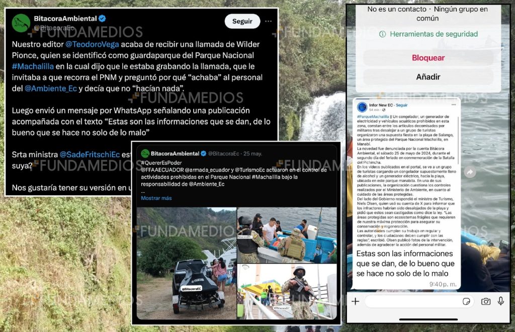 Ecuador, 26 de mayo de 2024· El periodista Franklin Vega, especializado en temas ambientales y editor de Bitácora Ambiental, recibió una llamada del guardaparque Wilder Pionce, quien criticó la información que había publicado el medio en redes sociales. El funcionario le advirtió que estaba grabando la llamada y le recomendó que recorriera el Parque Nacional Machalilla, donde él trabaja.