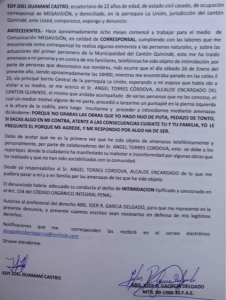 Guamaní, junto a su abogado defensor, Ider García Delgado, presentó la denuncia penal ante el Fiscal de Quinindé. Acusó al Alcalde encargado del presunto delito de intimidación, tipificado en el artículo 154 del Código Orgánico Integral Penal (COIP). El periodista expresó temer por su seguridad y la de su familia.